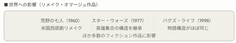 「荒野の七人」「スター・ウォーズ」「バグズ・ライフ」など数えきれないほどの名作がこの映画の構造やテーマを受け継いでいます。「少数精鋭の英雄が弱者を守る」というフォーマットはここから始まったと言っても過言ではありません。