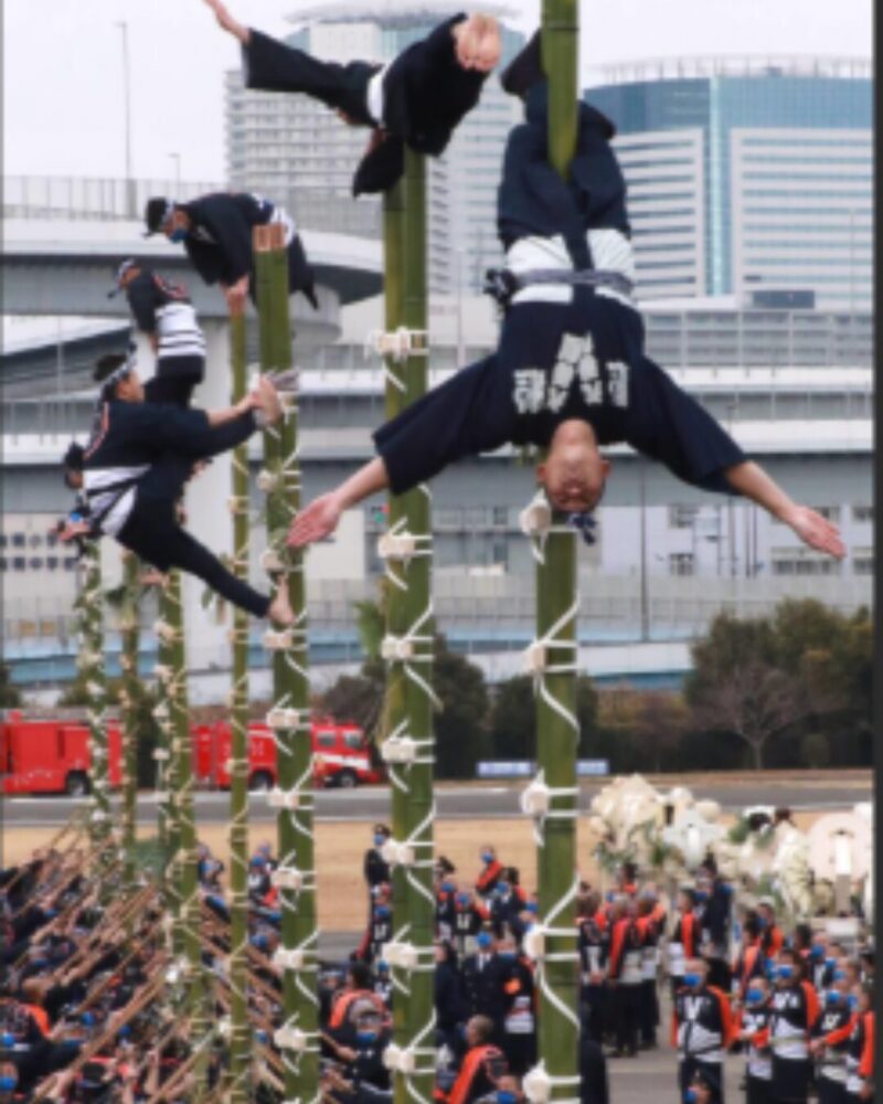 もっとも有名なのがこれです。高さ6メートル以上のはしごの上で、命綱なしで様々なポーズをとります。 もともとは、火事の際に高い場所から「風向き」や「火元」を確認するために、身軽な鳶(とび)職人が行っていた技術が発展したものです。