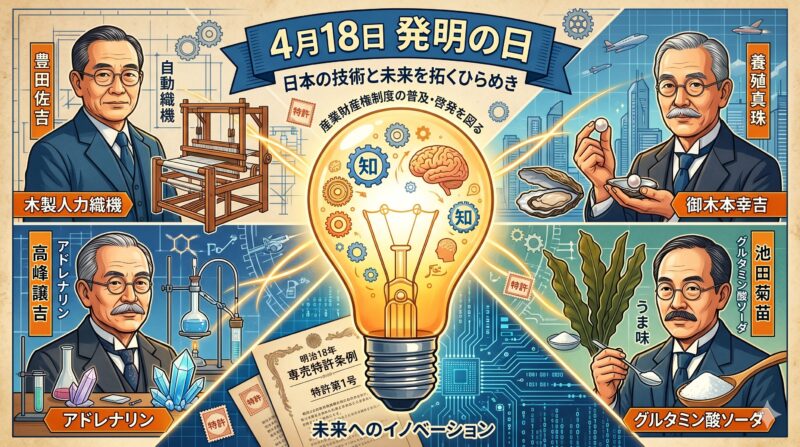 1885年4月18日、日本で専売特許条例(現在の特許法の前身)が公布されました。これを記念して、4月18日は「発明の日」に制定されています。